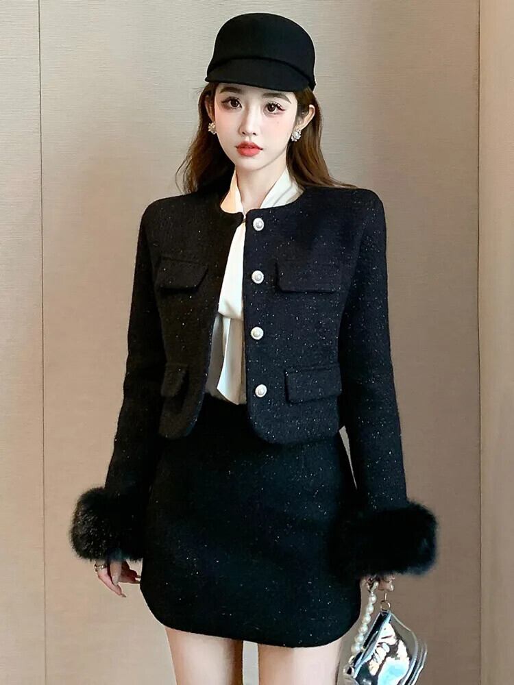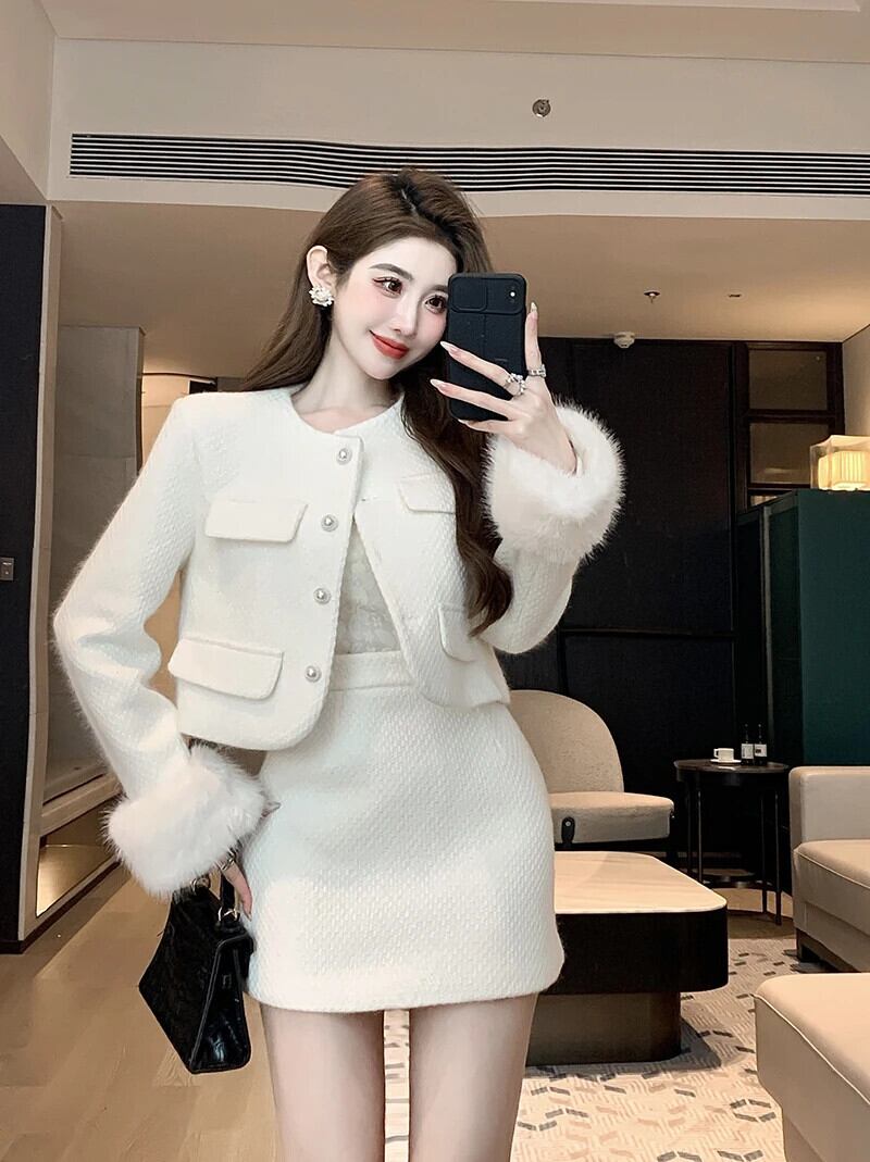 冬肥厚ウール 2 点セットぬいぐるみコート + スカートスーツ甘い 2 ピース衣装 大人ガーリー スウィート キュート カジュアル ウィンター 冬物