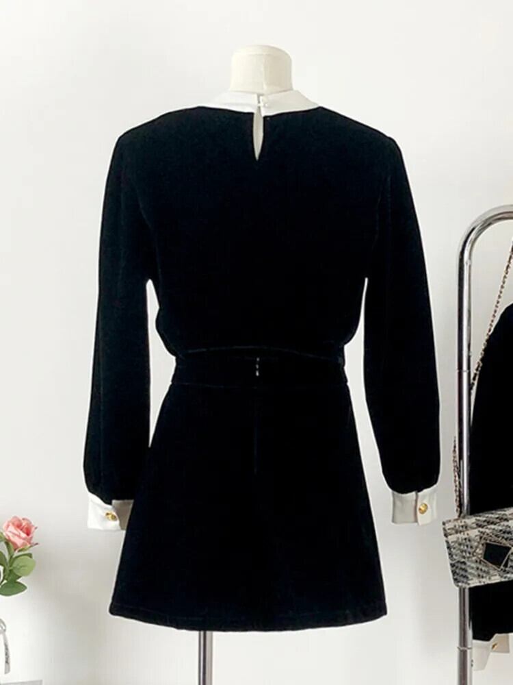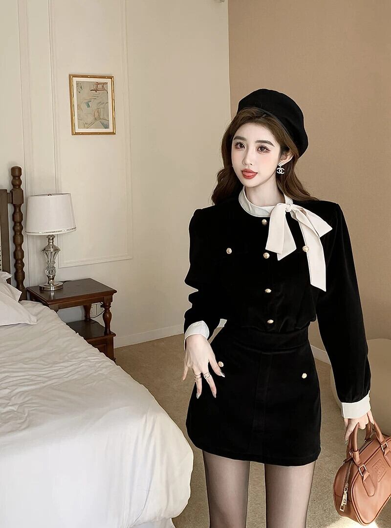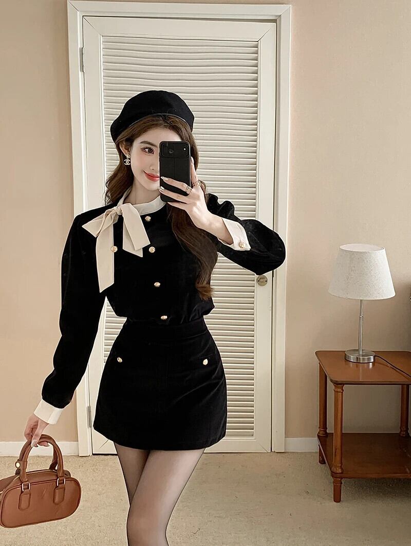 スイートシック小さ香りベルベット 2 点セット 2024 春弓シャツトップ + スカートスーツ Conjunto Femininos リボン 大人ガーリー スウィート キュート カジュアル スプリング 春物
