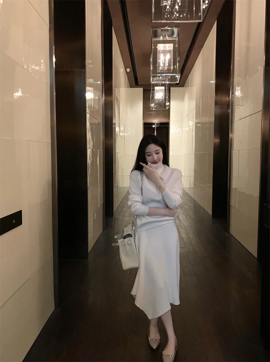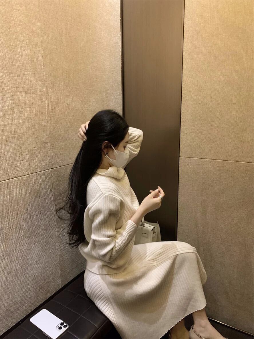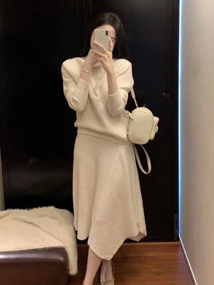秋冬ニット 2 点セットタートルネックプルオーバー + ロングスカートスーツ怠惰セット ウィンター 冬物