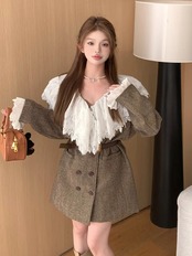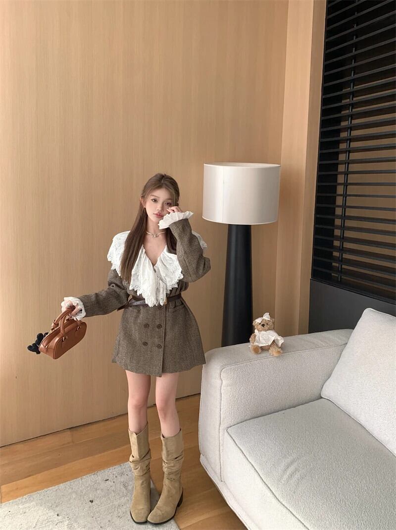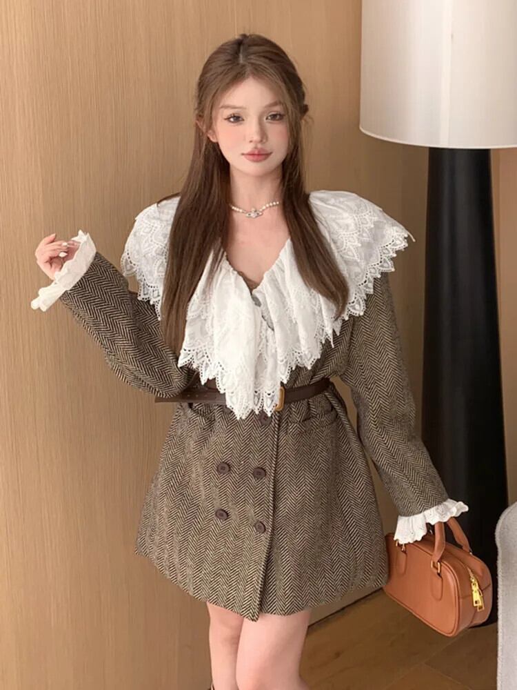 秋冬フレンチウール & ブレンドコートダブルブレストスリムウエストレース襟気質生き抜くベルト オータム 秋物 ウィンター 冬物 ハーネス