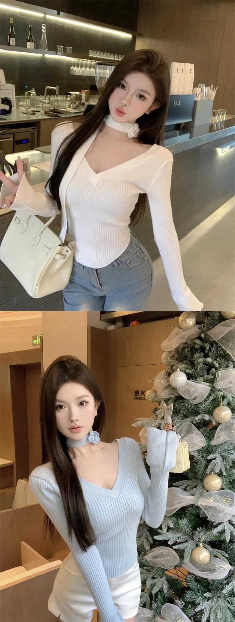2024 春甘いシック V ネックニットセータープルオーバー Hotsweet セクシー基本セーターフィットソフト暖かいトップスプル 大人ガーリー スウィート キュート カジュアル スプリング 春物 Vネック