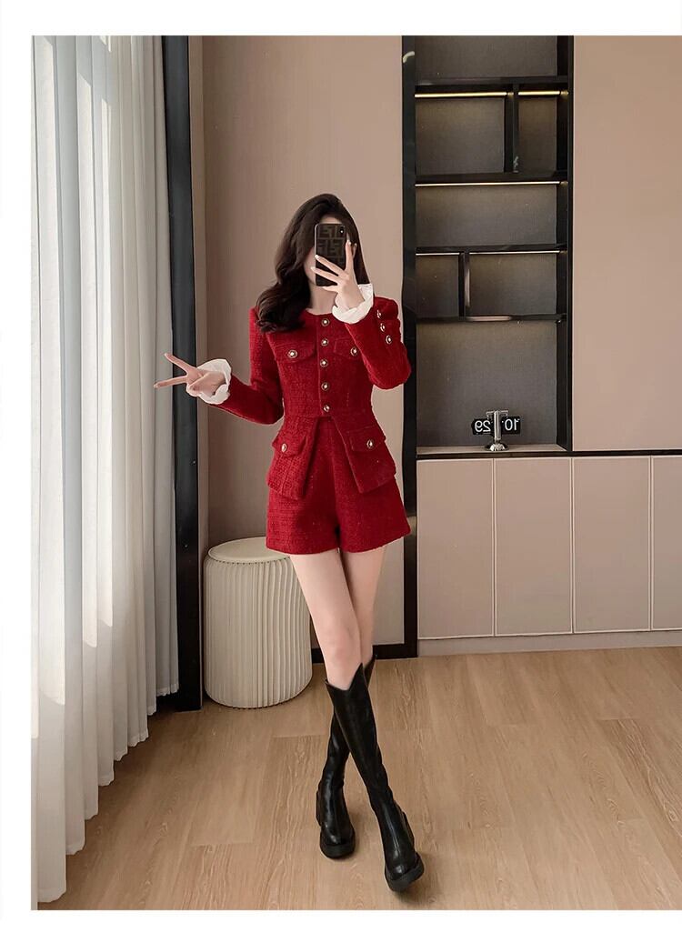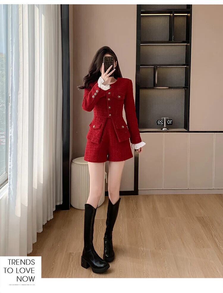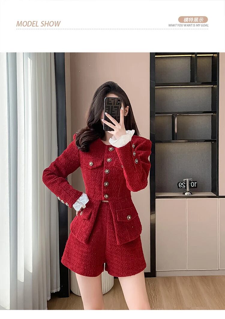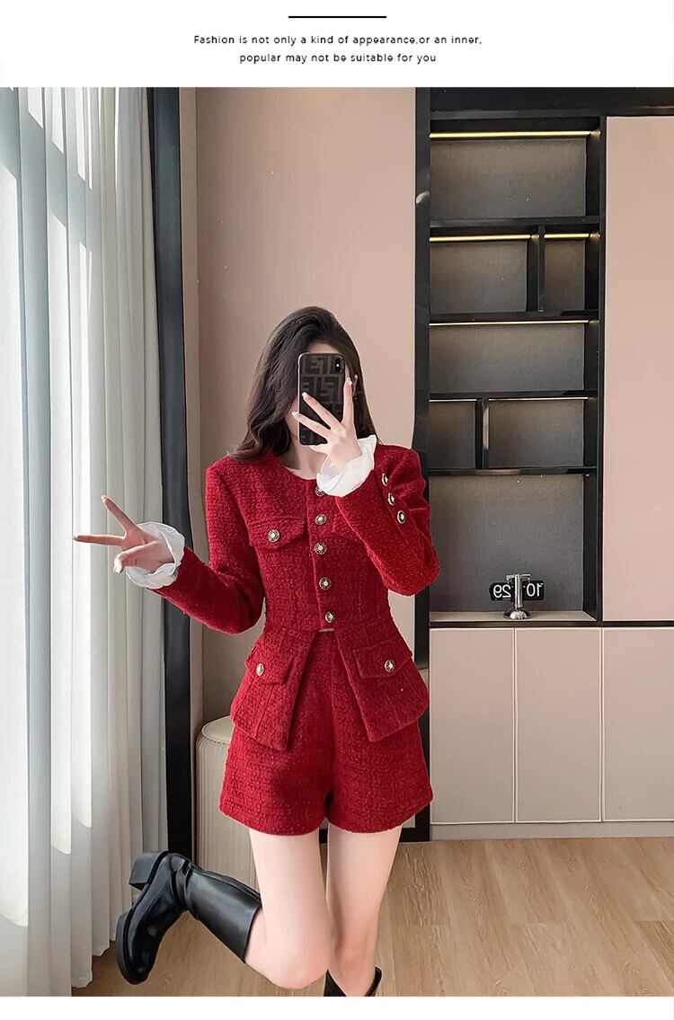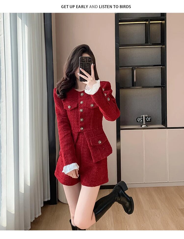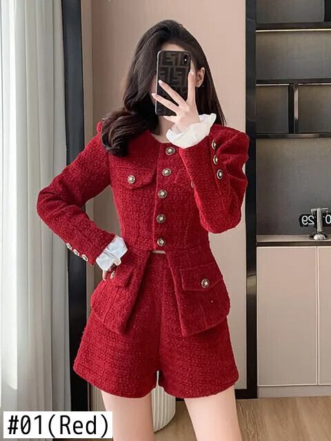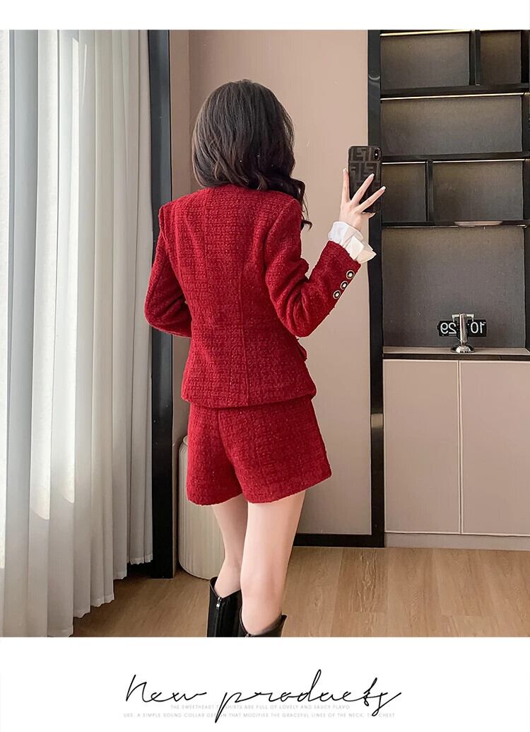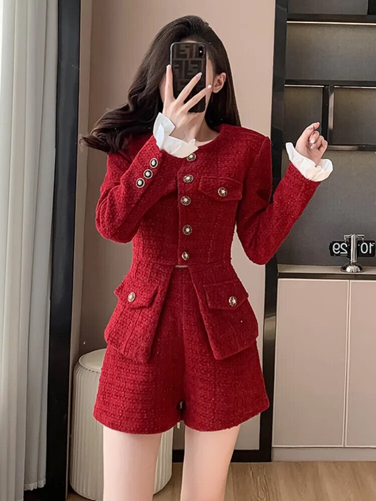 秋冬ツイードツーピースパンツセットストリート高級ジャケットコート+ショート2点セット衣装 オータム 秋物 ウィンター 冬物