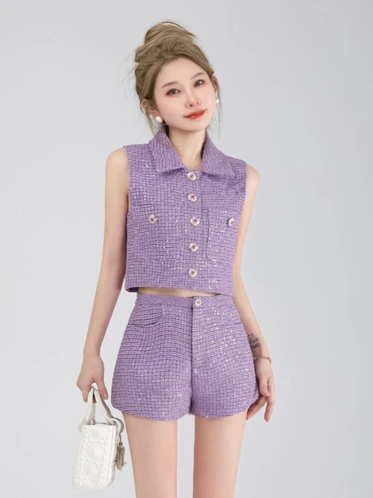 2024 春可能 - 終了スモールフレグランスベストクロップトップ + ショートセットサマースウィートガールズ 2 ピースパンツセット 大人ガーリー キュート カジュアル スプリング 春物 夏物