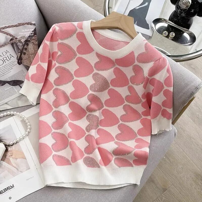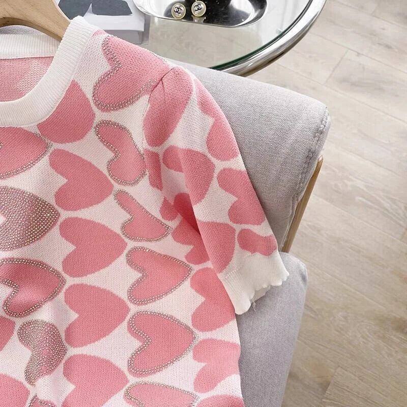 2024 夏半袖ニットアイスプルオーバートップス甘い愛ダイヤモンドスリム Tシャツ ショート ハーフスリーブ 大人ガーリー スウィート キュート カジュアル サマー 夏物 シルク
