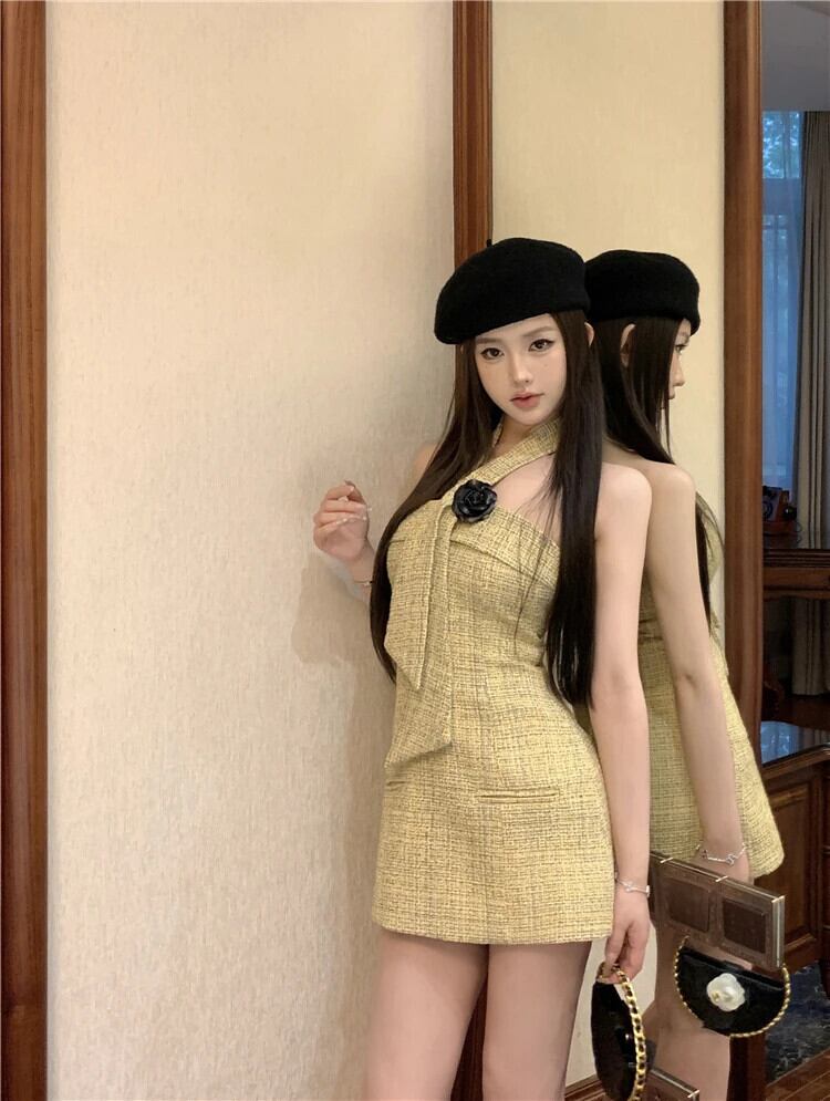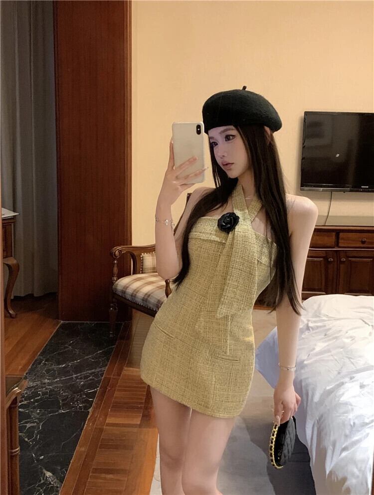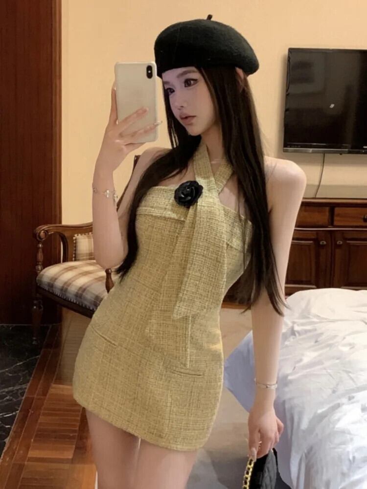 ハンギングネック Hotsweet セクシードレス 2024 夏甘い 3D フラワーツイードミニパーティードレス 大人ガーリー スウィート キュート カジュアル サマー 夏物 フラワーデザイン