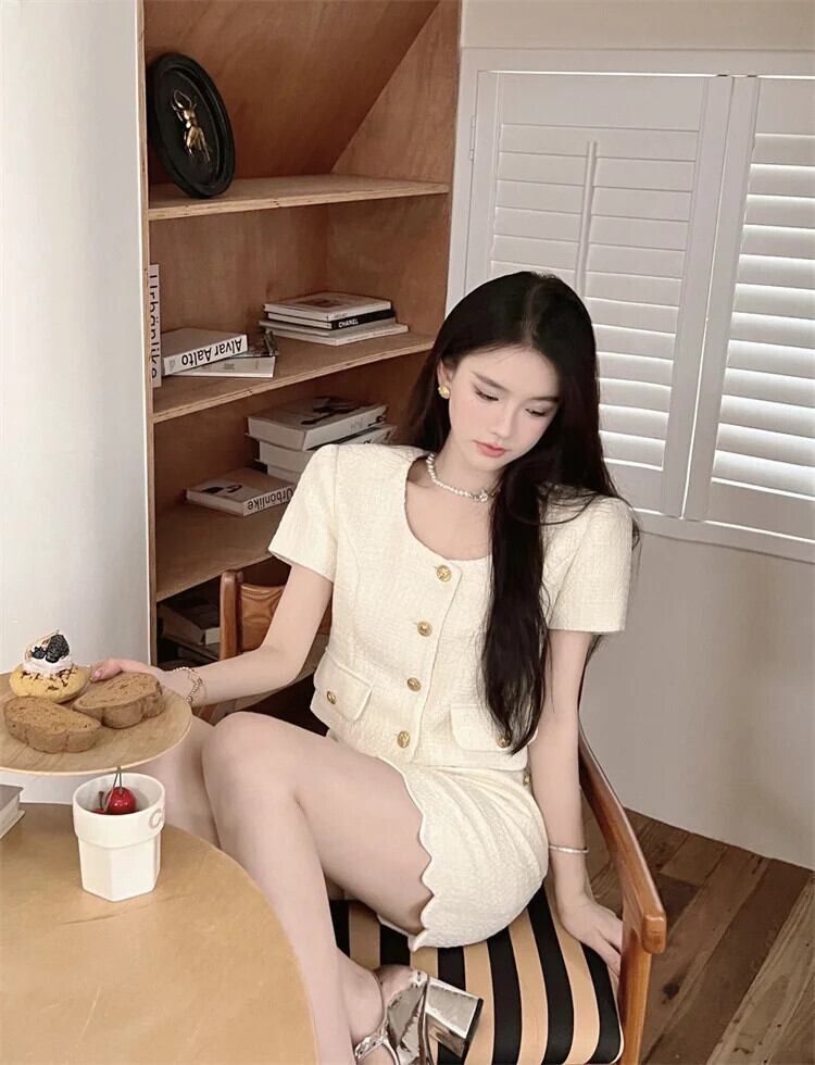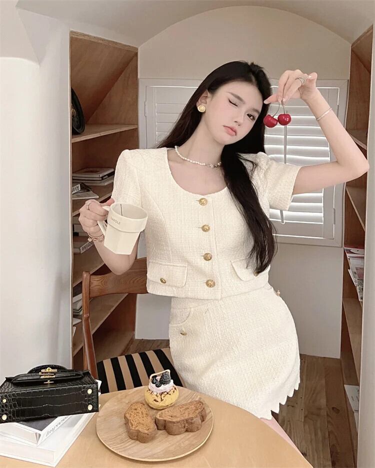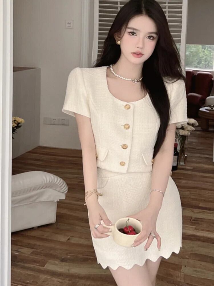 フランス小さフレグランススーツショートジャケットコートクロップトップ & スカートセット 2024 夏ストリートレディツーピースセット サマー 夏物