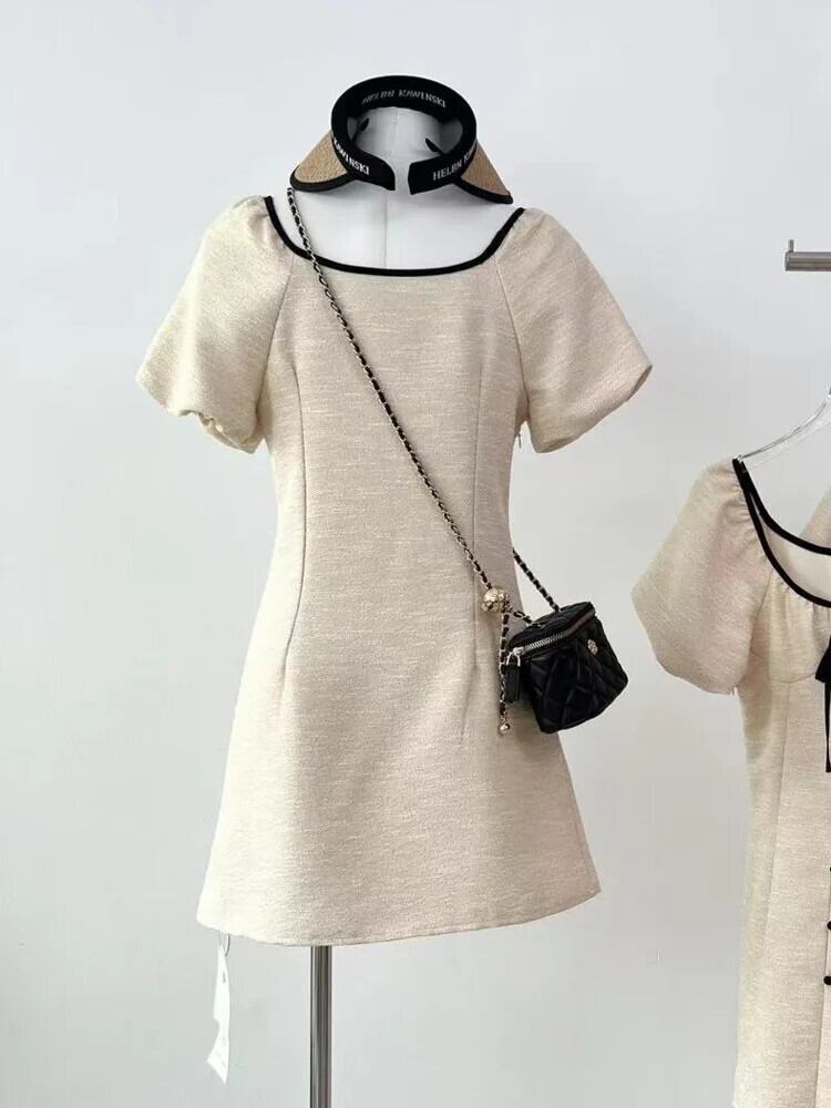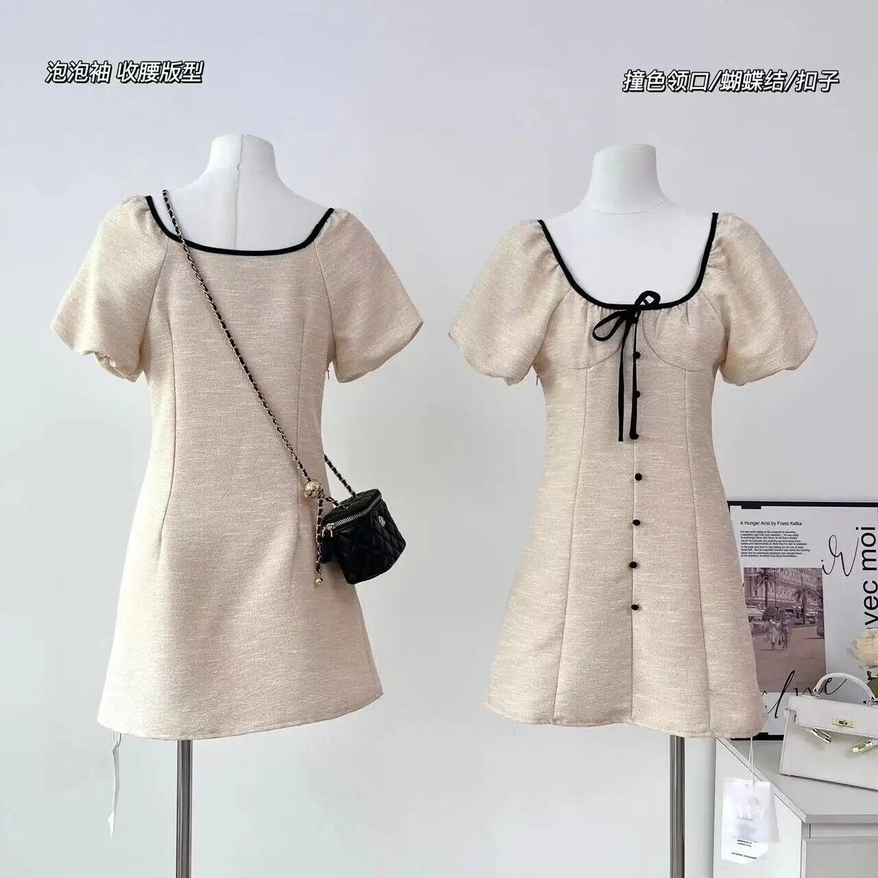 2024 夏小さフレグランスミニパーティードレスパフスリーブスリムウエストセクシードレスローブ Vestido Feminino サマー 夏物