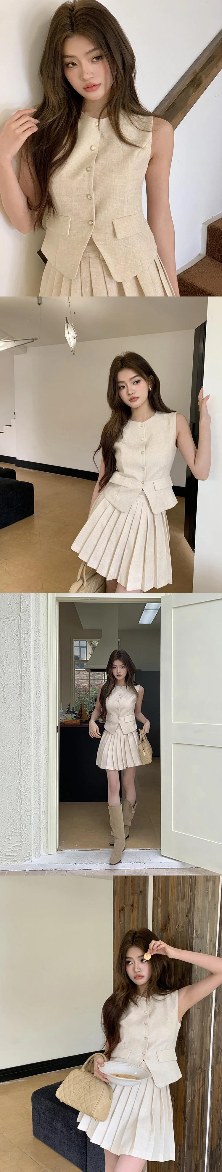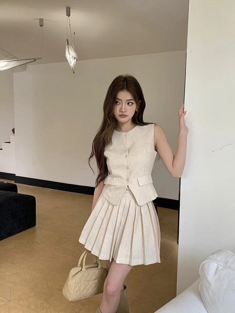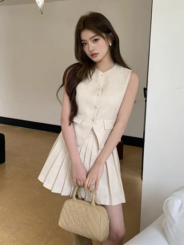 2024 夏スカートセットライト高級エンドベストプリーツスカート 2 点セット Lady Conjuntos Cortos サマー 夏物