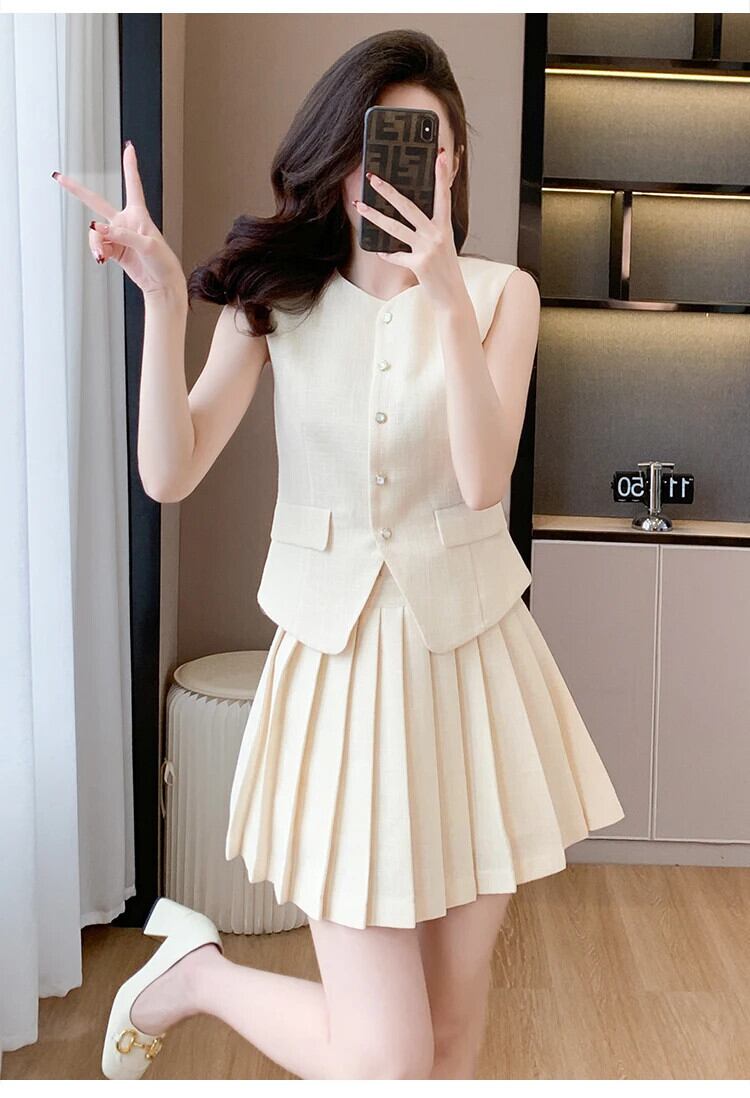 OL ツーピースセットベストトップス + プリーツスカートスーツ小さ香り夏 2 点セット衣装 サマー 夏物