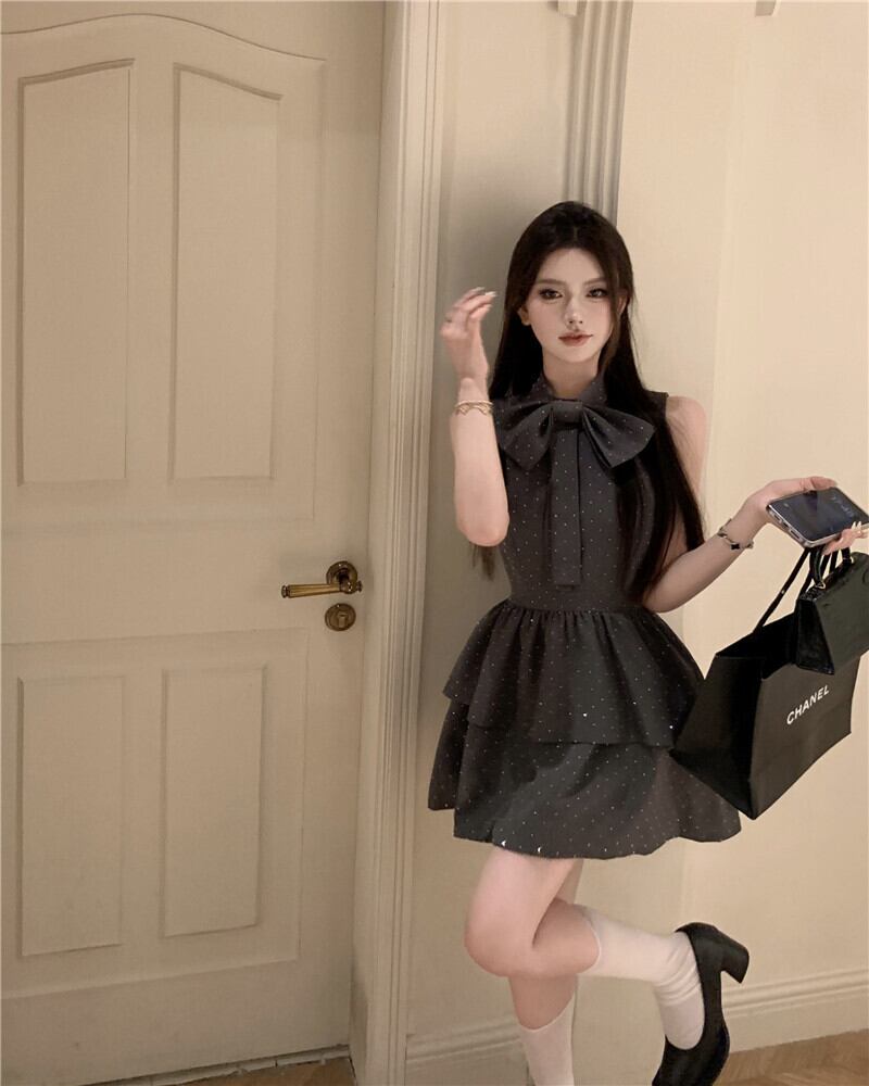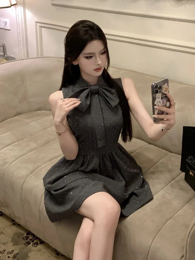 甘い弓サマードレス 2024 小さフレグランスレディミニドレスパーティーローブ Vestidos Femenino リボン 大人ガーリー スウィート キュート カジュアル 夏物