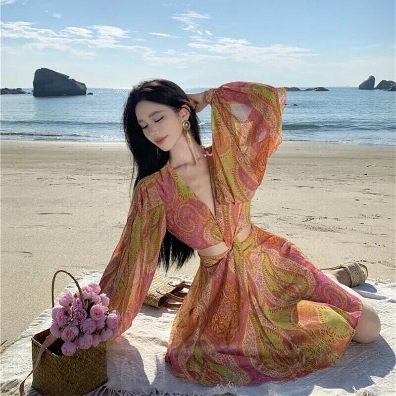 Vestidos 2024 夏ルースセクシー V ネック長袖ビーチドレスフラワープリントパーティードレスイブニングドレス ロング サマー 夏物 Vネック フラワーデザイン