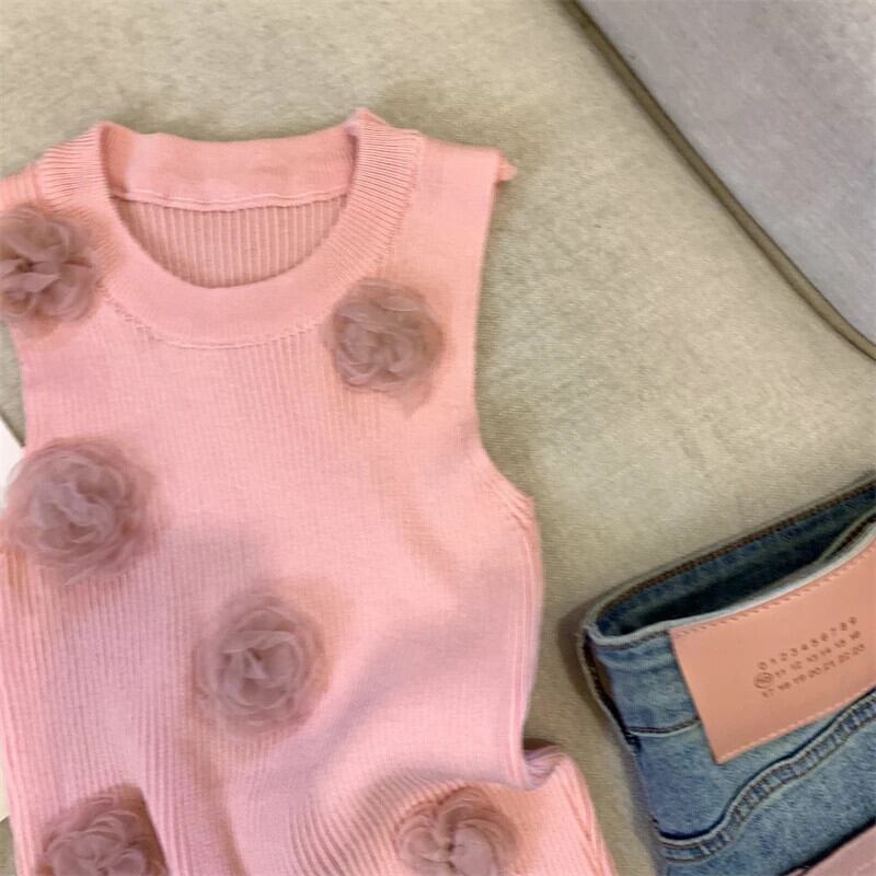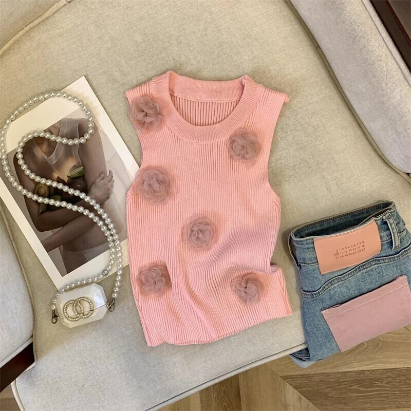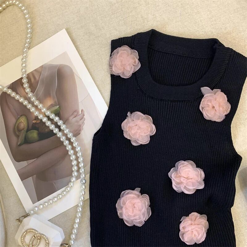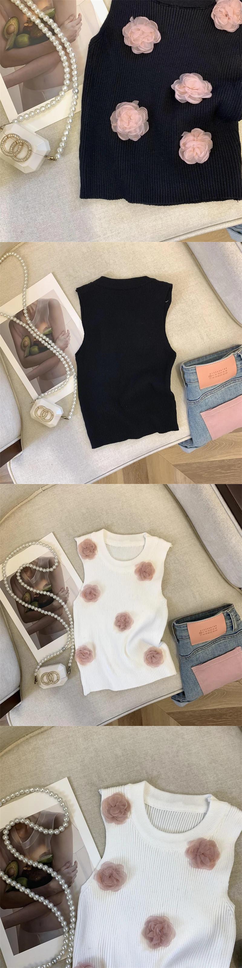 アイスニットタンクトップ夏甘い花ボトム Tシャツホットスウィートセクシーノースリーブベスト 大人ガーリー キュート カジュアル サマー 夏物 シルク フラワーデザイン