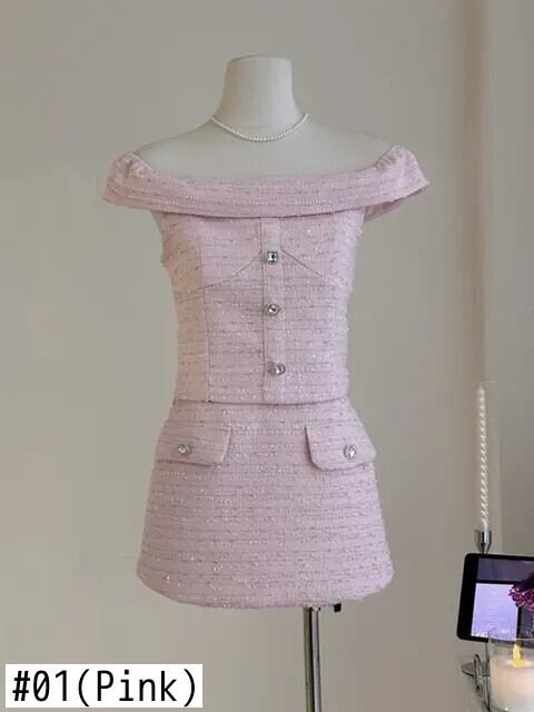 フレンチ ツイード ツーピース セットトップ + ミニスカート セット Y2K 甘い 2 ピース スーツ 大人ガーリー スウィート キュート カジュアル