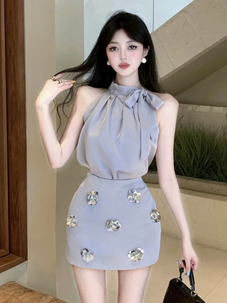 ストリートフレンチ小さ香りツーピースセットトップス + 3D 花スカートスーツ夏 HotSweet セクシー 2 ピース衣装 大人ガーリー スウィート キュート カジュアル サマー 夏物 フラワーデザイン