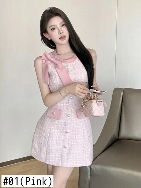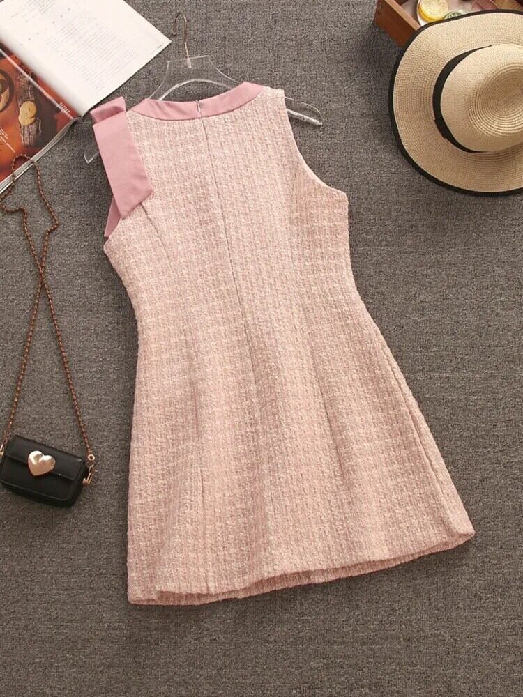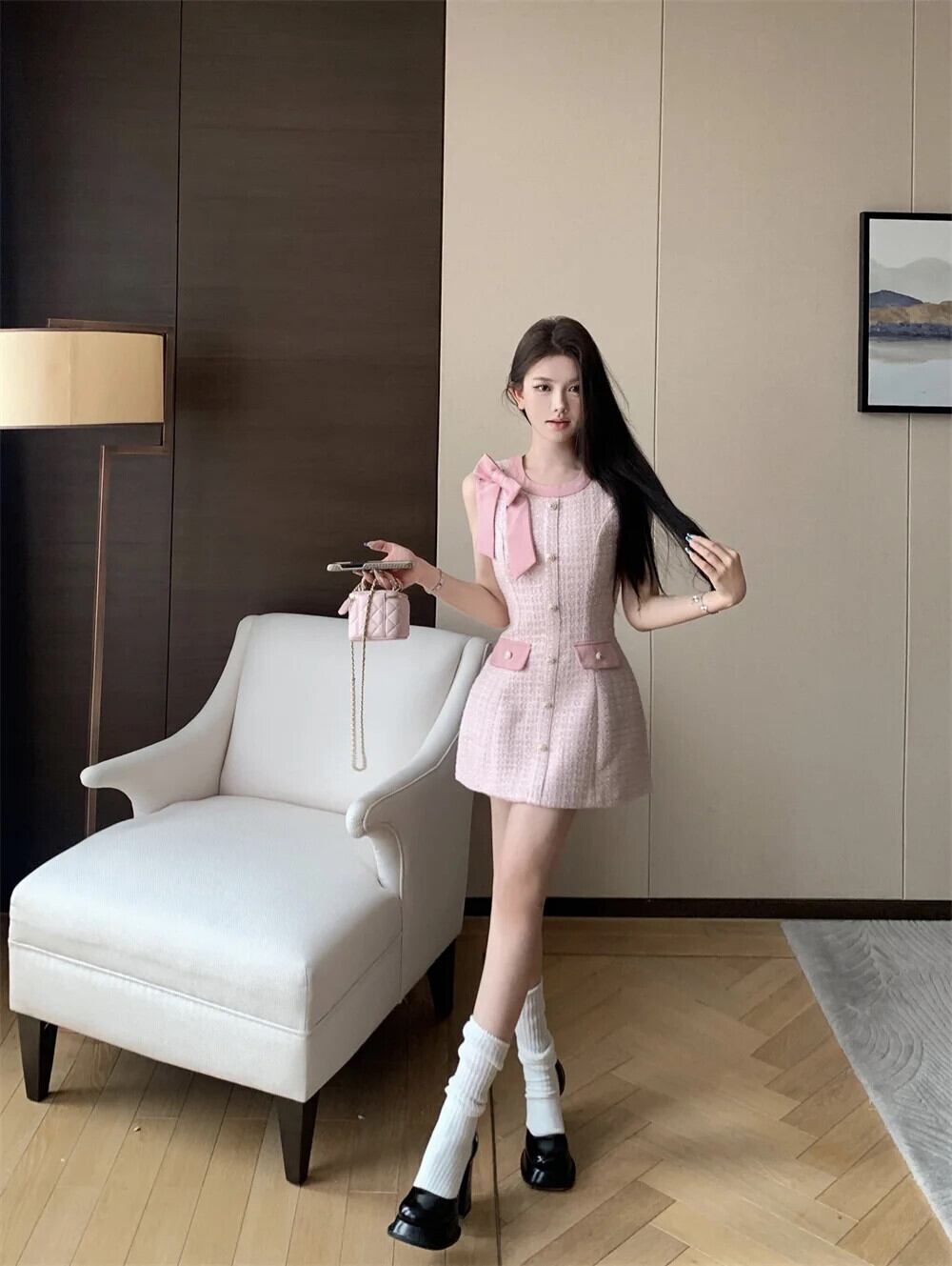 2024 フレンチスモールフレグランスツイードドレス夏甘い弓ミニドレスパーティー Vestidos リボン 大人ガーリー スウィート キュート カジュアル サマー 夏物