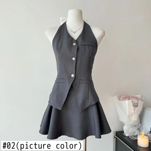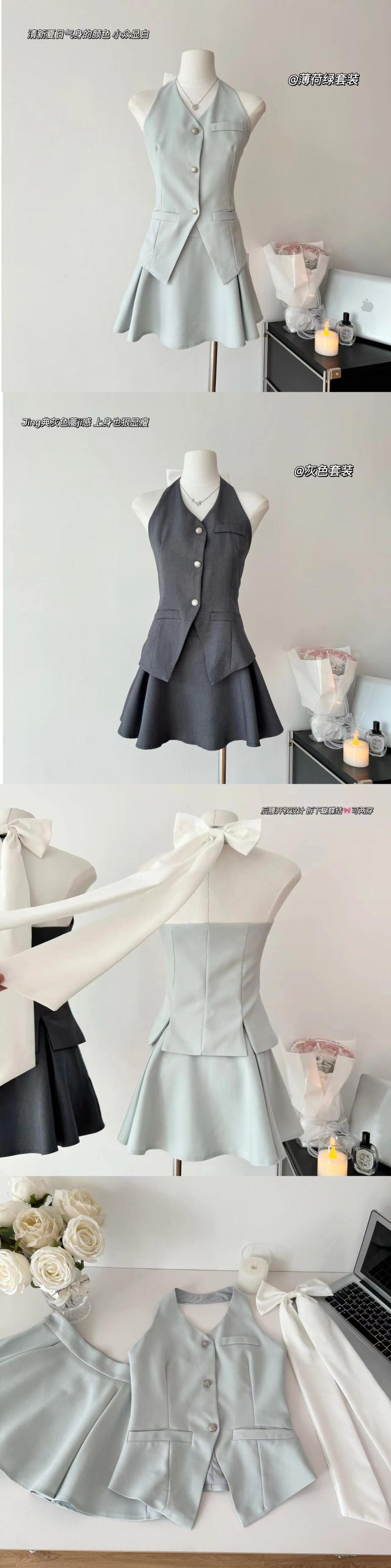 2024 夏フレンチスカートセット弓コントラストスーツベスト + ミニスカートツーピーススーツ衣装 Conjuntos Cortos リボン サマー 夏物