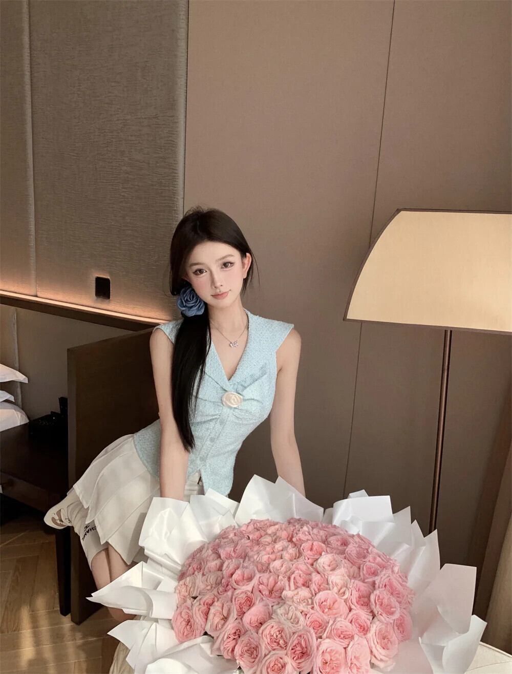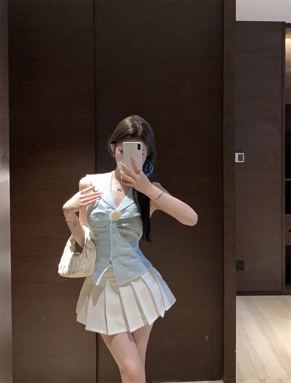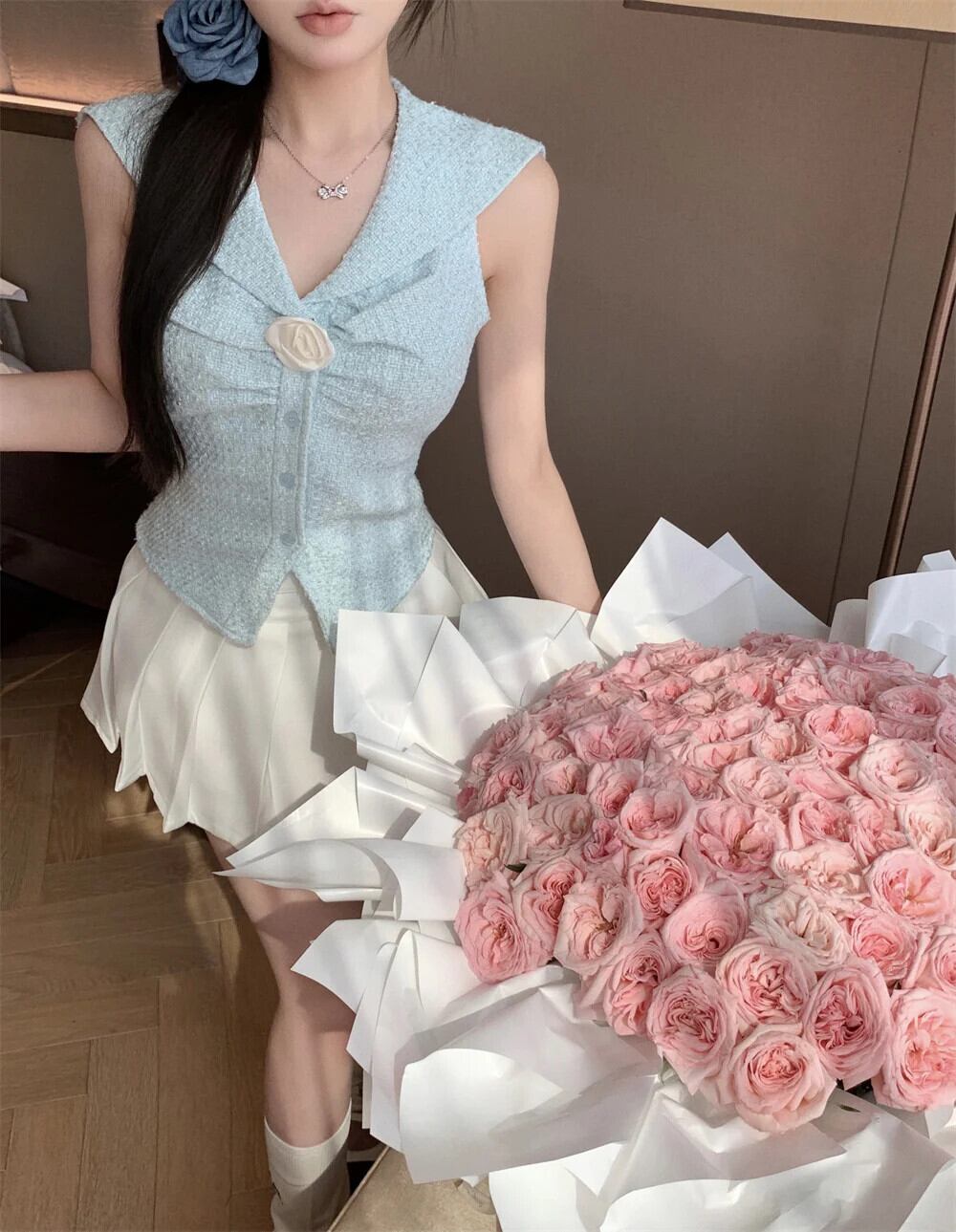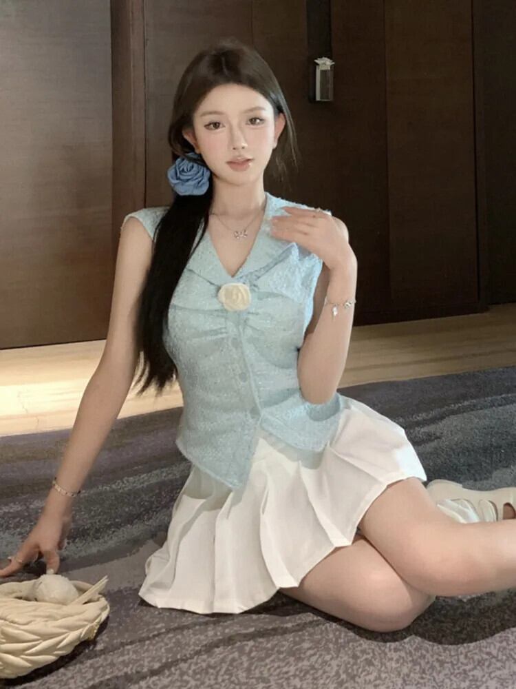 フレンチスイートスモールフレグランスツイード2点セットベストトップス+プリーツスカートスーツ夏2点セット 大人ガーリー スウィート キュート カジュアル サマー 夏物