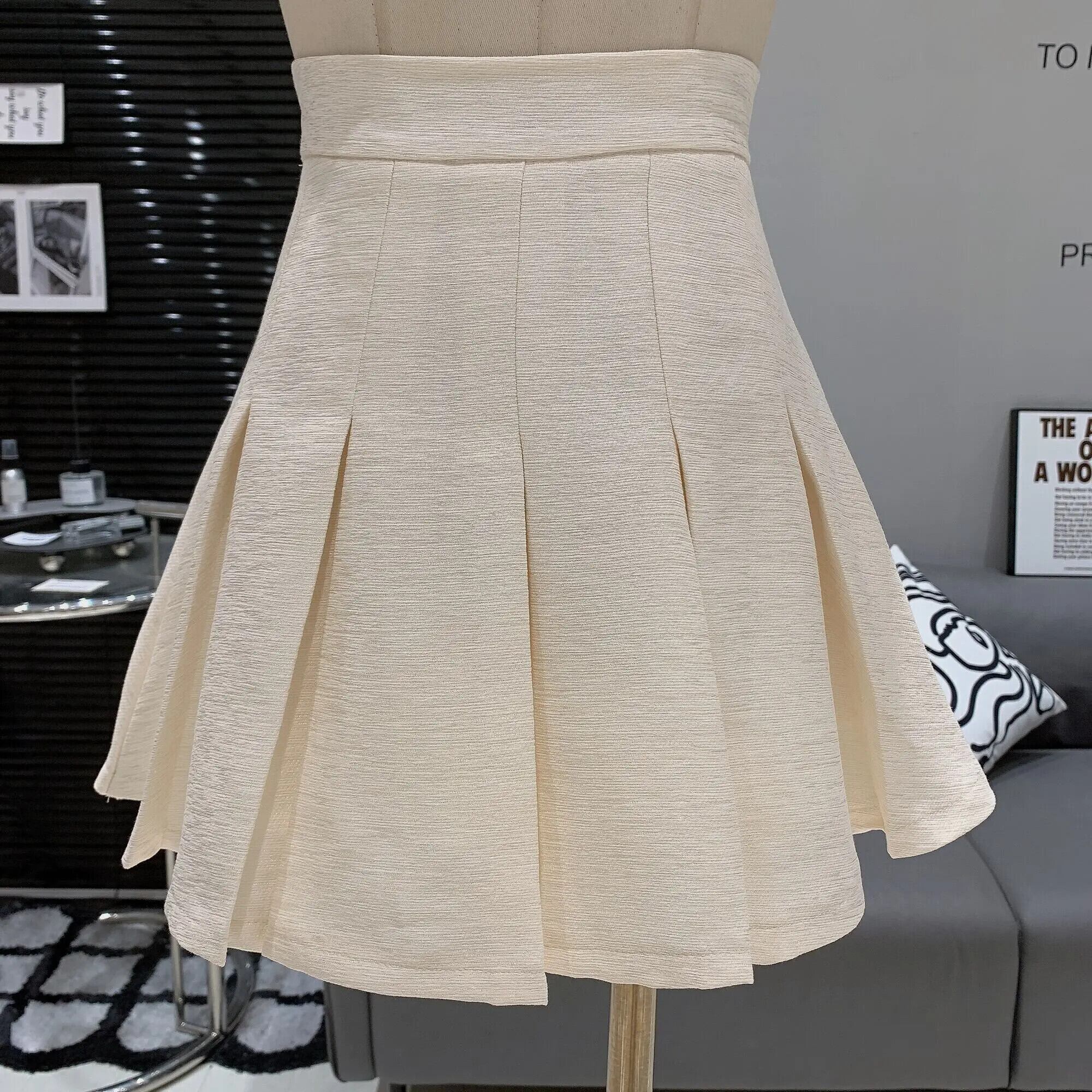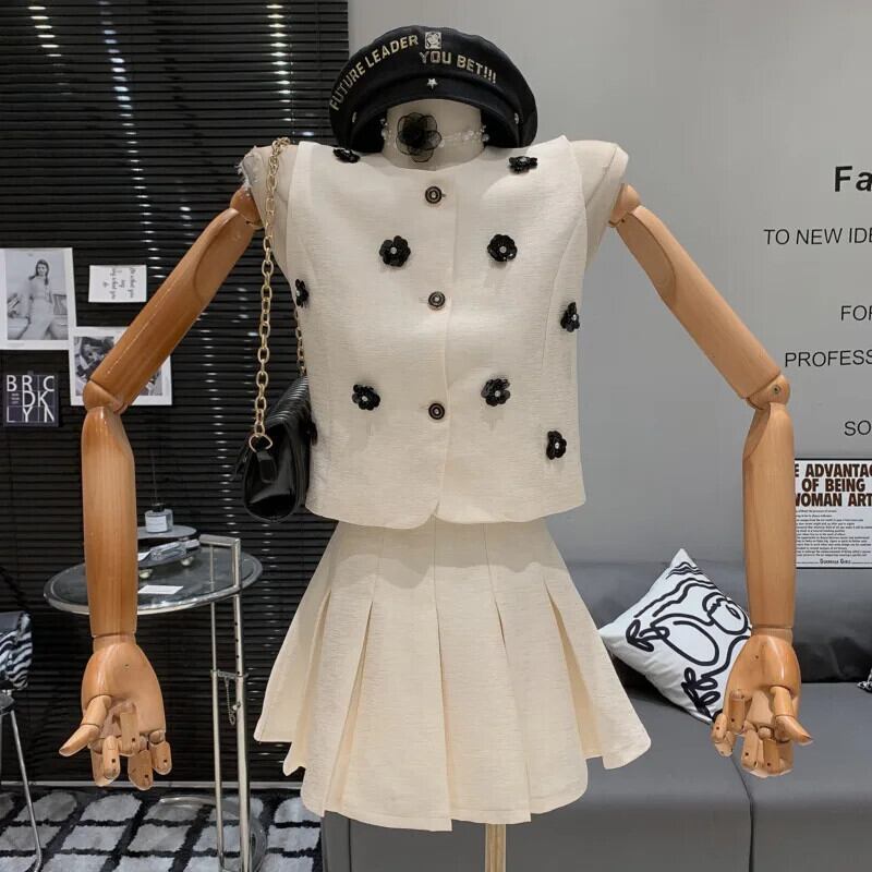 ストリートフレンチ立体フラワーライト高級ベストトップ+ウエストAラインプリーツスカート2点セット フラワーデザイン
