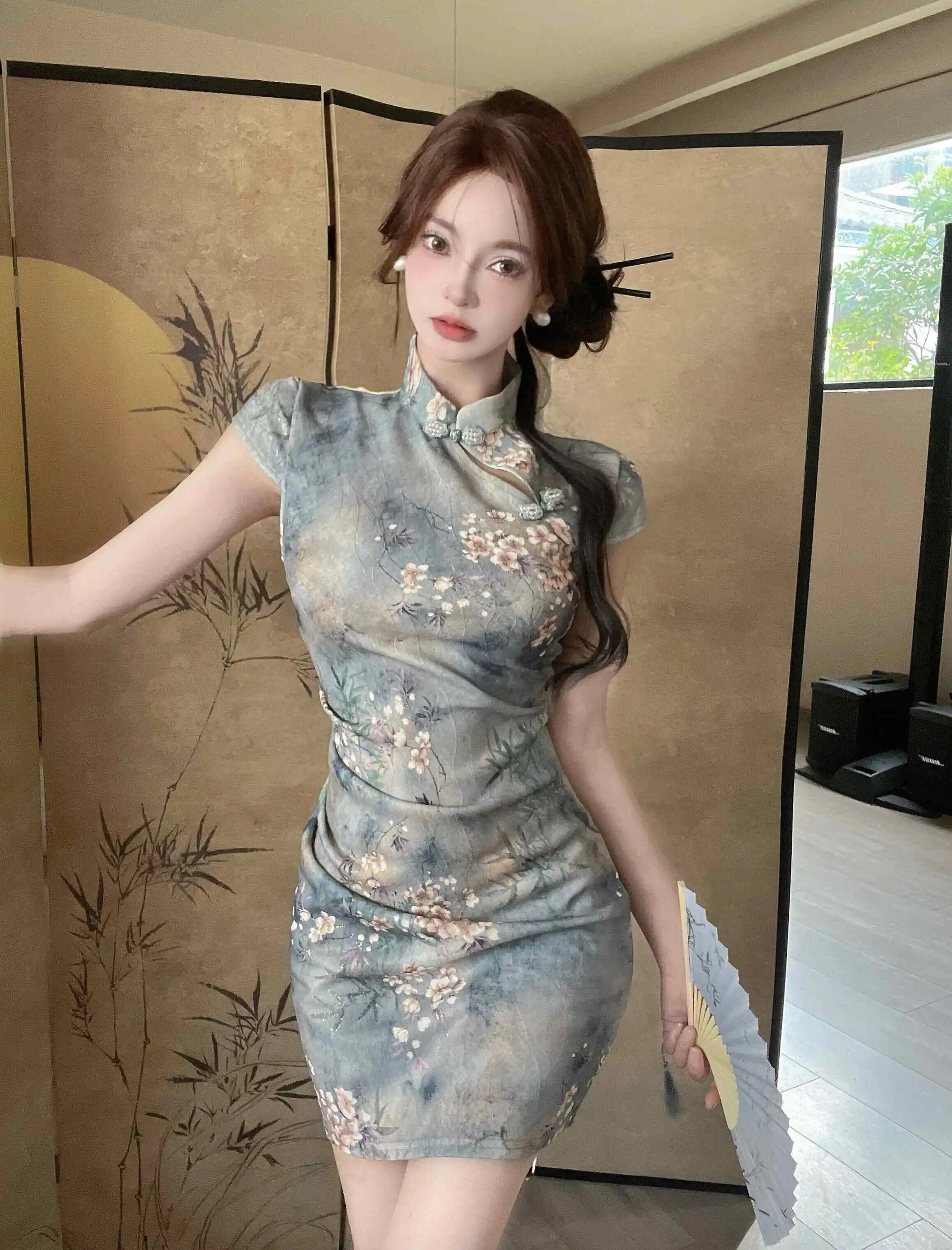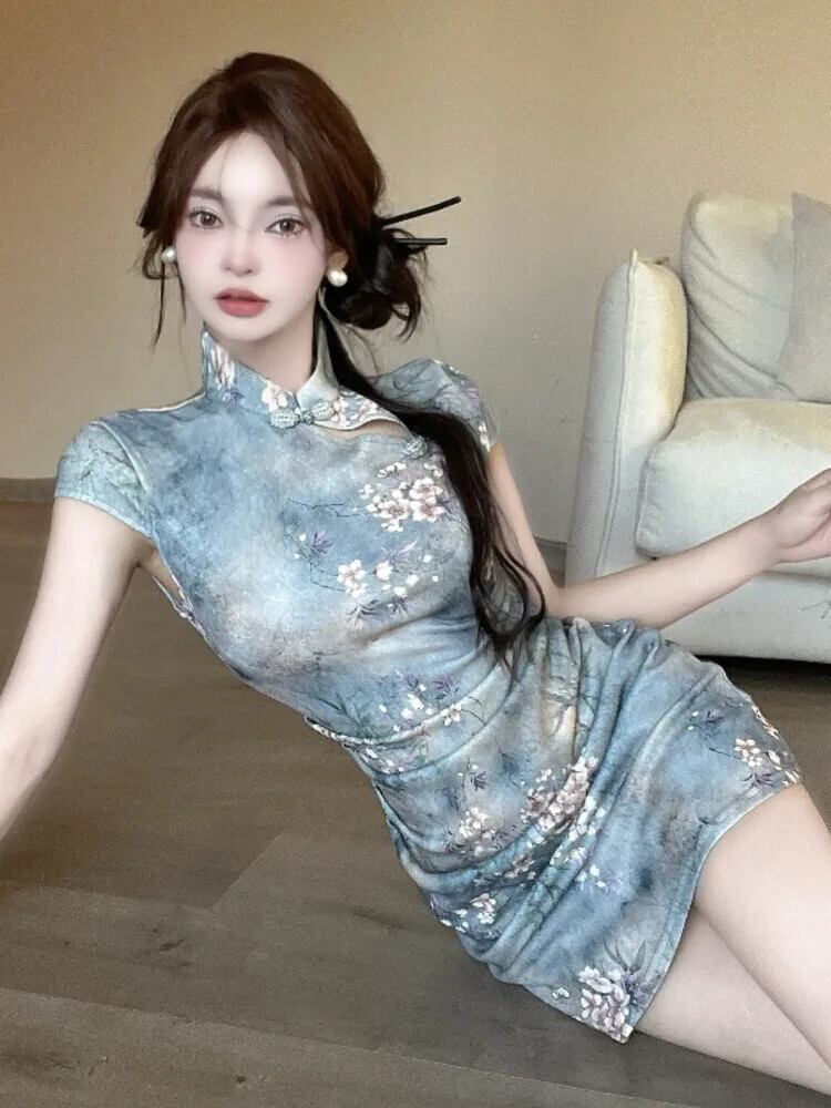 中国風改良チャイナプリントサマードレススリムウエストシースパーティードレス Vestidos ローブ 夏物