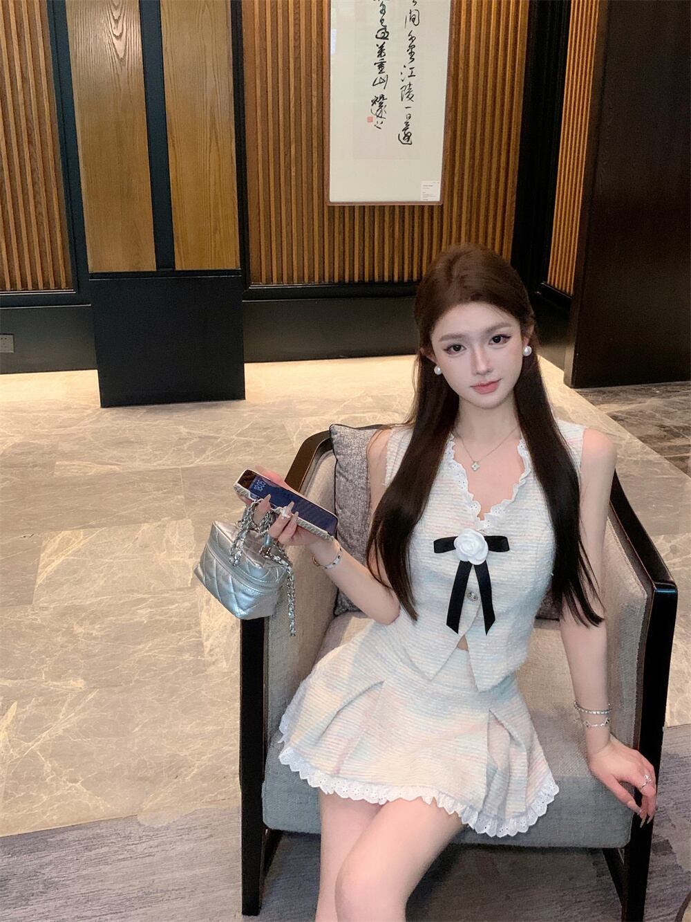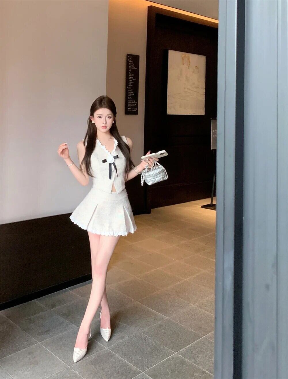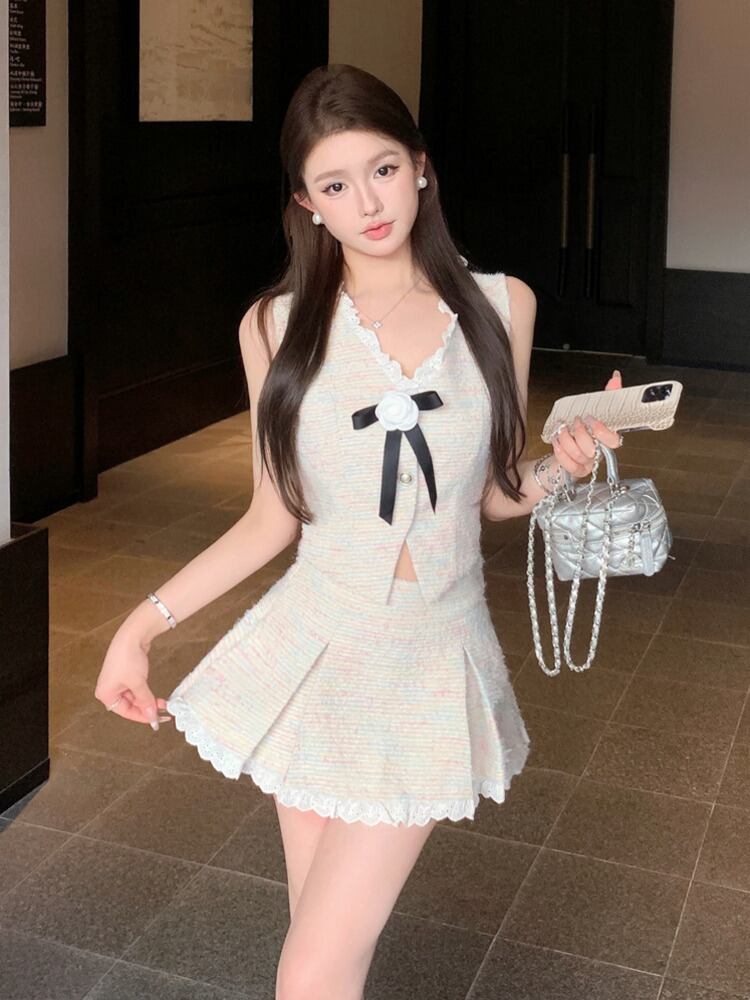 Hotsweet フランス小さフレグランツイード 2 点セット弓セクシートップ + スカートセットガールスイート 2 ピース衣装 リボン 大人ガーリー スウィート キュート カジュアル