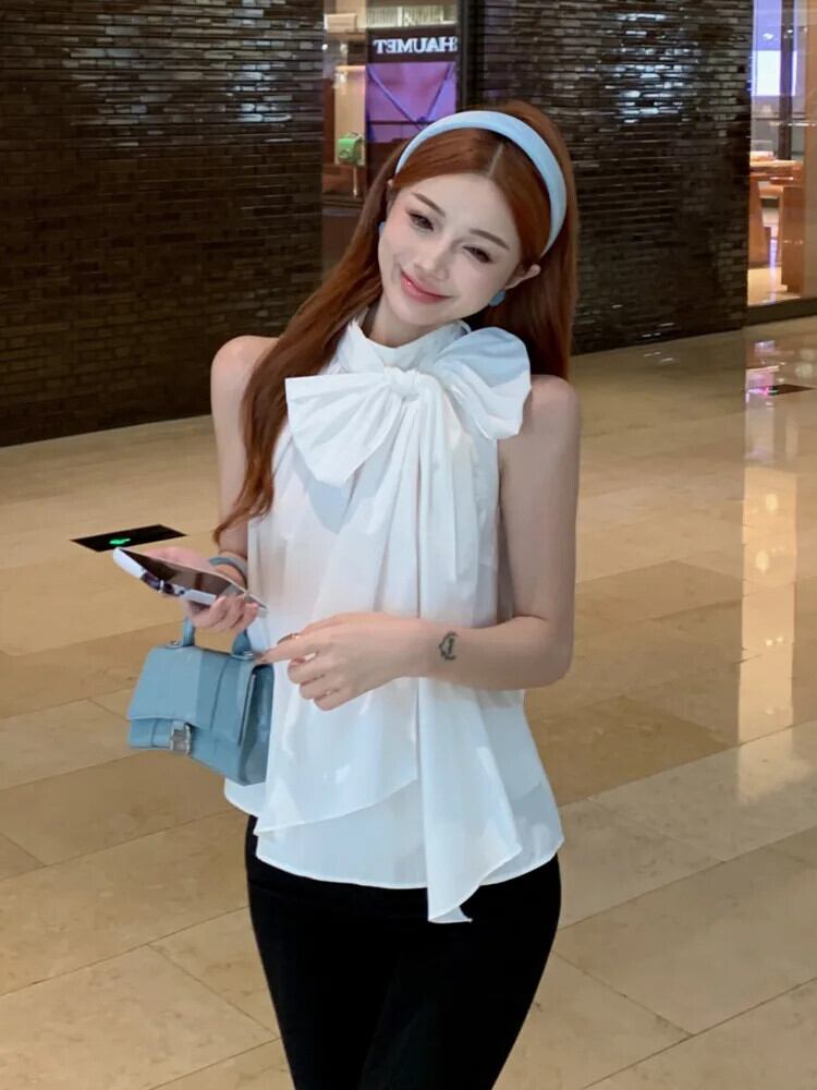 フランスノースリーブ蝶ネクタイシャツ & ブラウス 2024 夏甘い優しいルーズシャツトップ リボン 大人ガーリー スウィート キュート カジュアル サマー 夏物