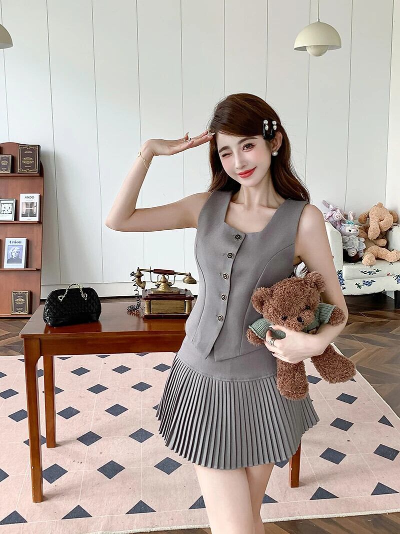 OL 2 点セットベストトップス + プリーツスカートセット甘いツーピーススーツ 大人ガーリー スウィート キュート カジュアル