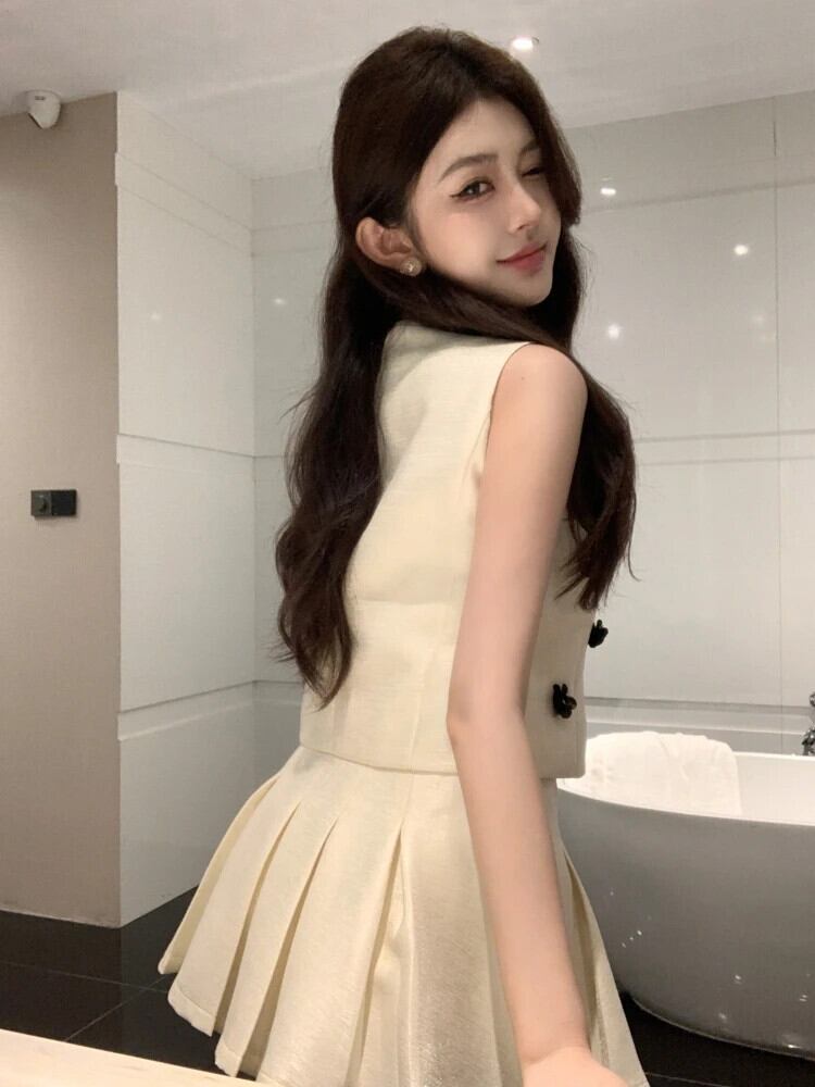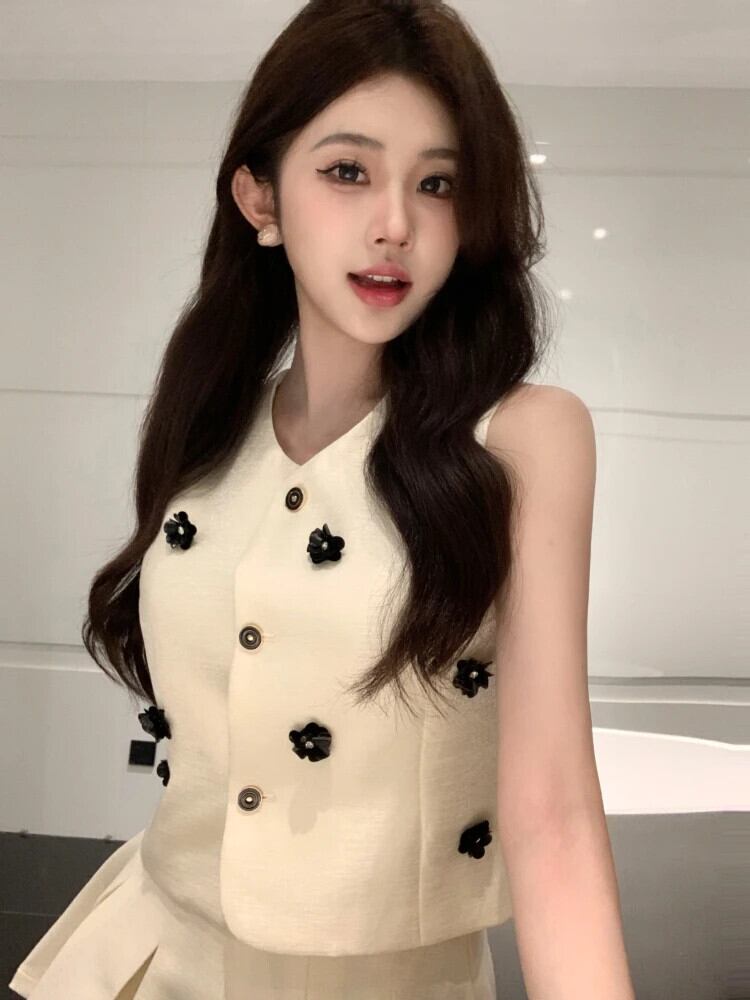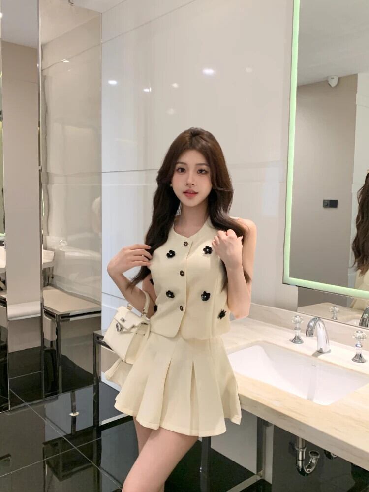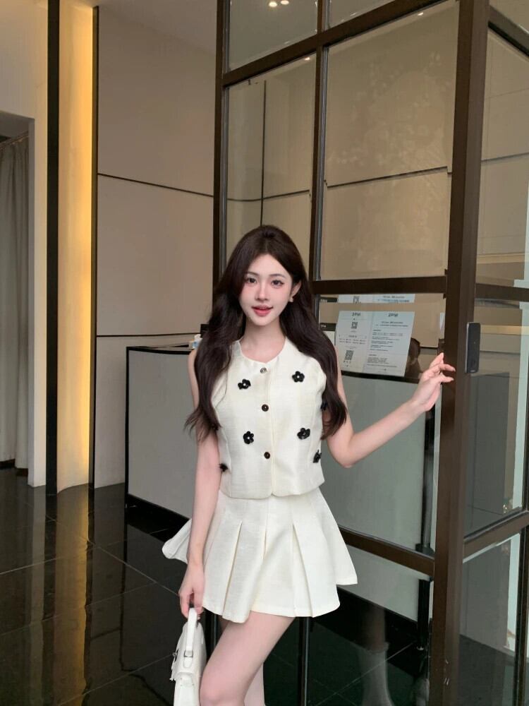 夏小さ香り甘いツーピースセット 3D 花クロップトップ + プリーツスカートスーツ 2 ピース衣装 大人ガーリー スウィート キュート カジュアル サマー 夏物 フラワーデザイン