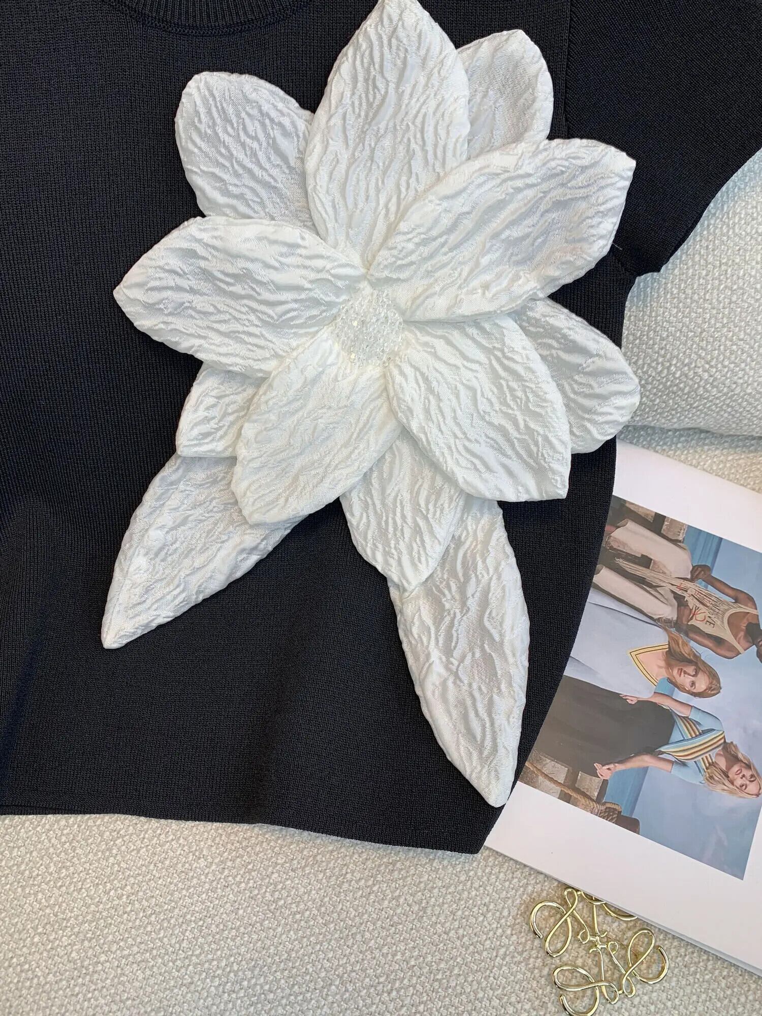 フランス立体花半袖ニット Tシャツ夏ガール Hotsweet セクシー Tシャツトップ ショート ハーフスリーブ 大人ガーリー スウィート キュート カジュアル サマー 夏物 フラワーデザイン