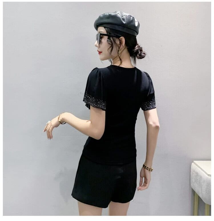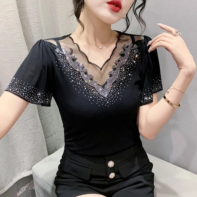 2024 夏メッシュヘビークラフトダイヤモンドスリムシャツトップ半袖 V ネックレディース Tシャツトップス ショート ハーフスリーブ サマー 夏物 Vネック