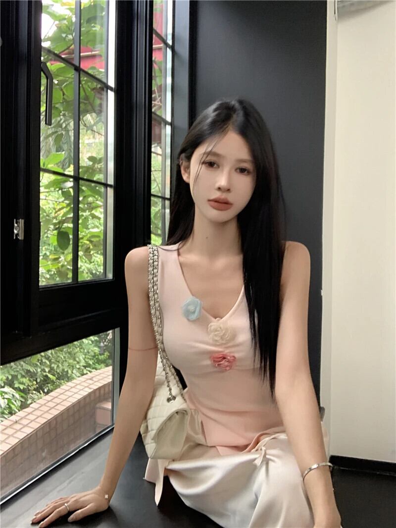 2024 夏三次元花ベストトップフレンチスリムフィットスプリット Tシャツノースリーブ V ネックプルオーバー Tシャツ サマー 夏物 花柄 Vネック