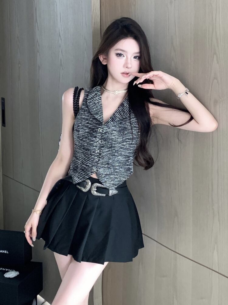 フレンチスモールフレグランスツーピースセットツイードベストトップ+スカートスーツガールスイート2ピース衣装 大人ガーリー スウィート キュート カジュアル