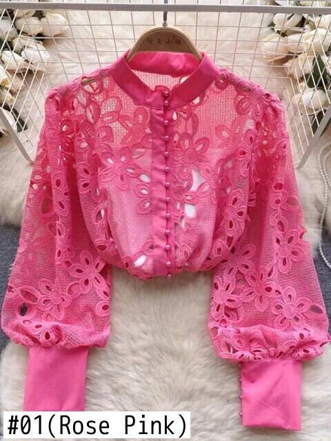フランス人レースシャツ&ブラウス2024秋パールボタン付き長袖トップ ロング オータム 秋物 真珠