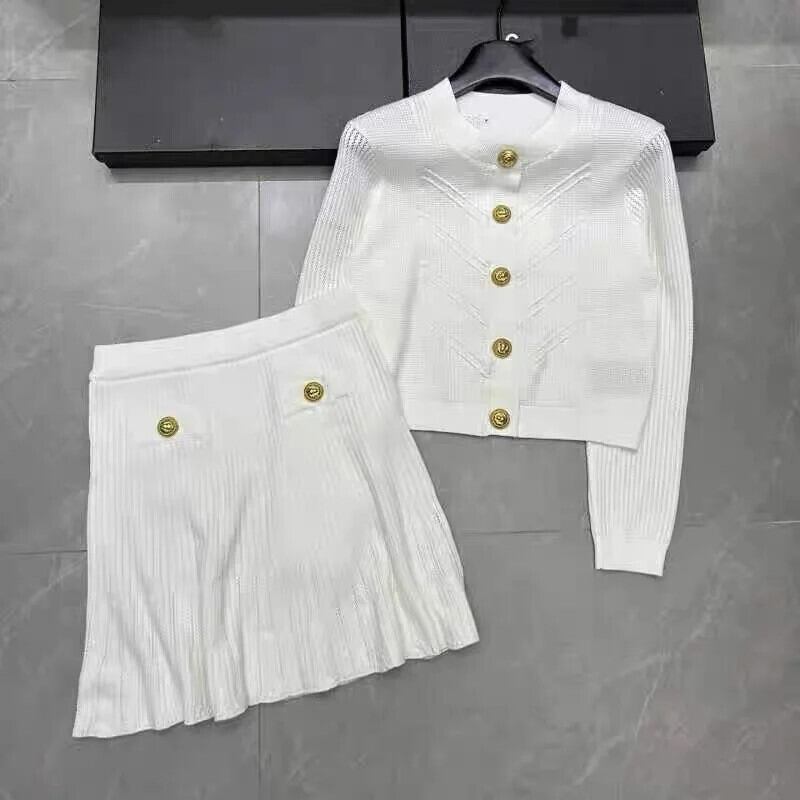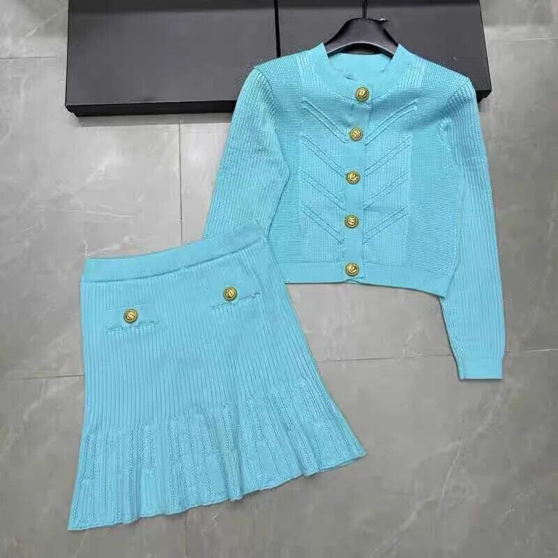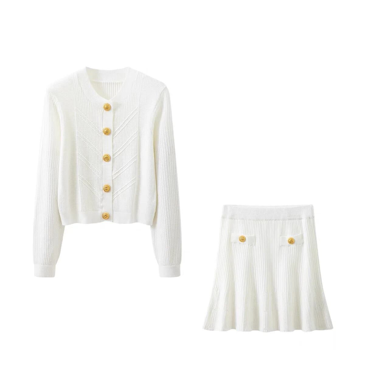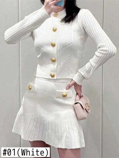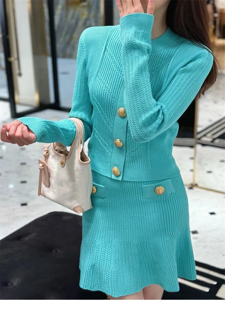 ストリートニット 2 ピーススカートセット O ネック長袖セーターカーディガンコート + ウエストスカートスーツ ロング Oネック