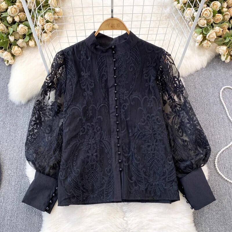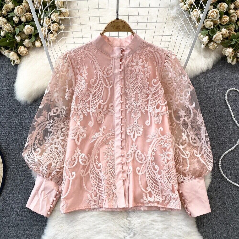 フランスメッシュシャツ & ブラウス 2024 秋真珠ボタンレース長袖トップ ロング オータム 秋物 パール