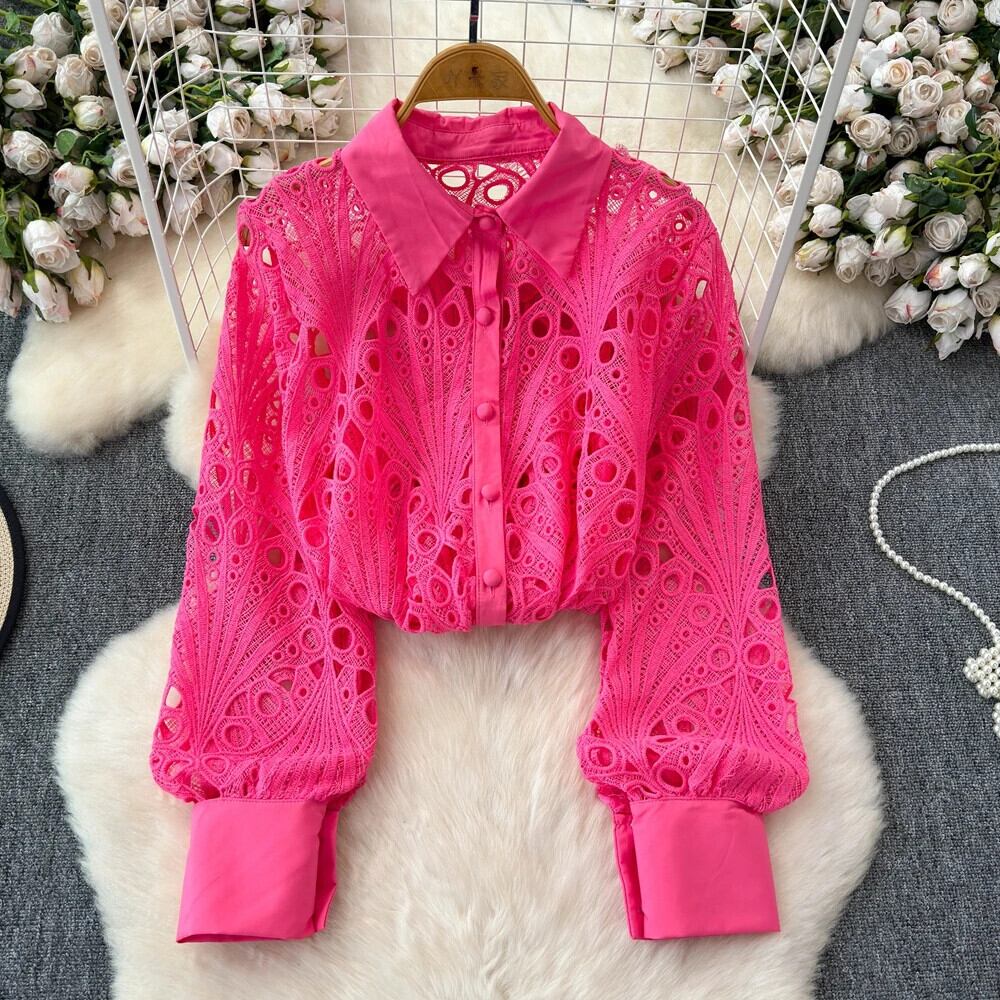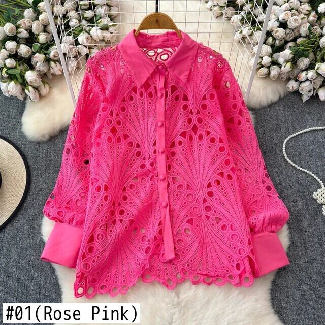 フレンチシック シャツ & ブラウス レディース アウト レース ブラウス 長袖 ルーズ トップ 送料無料 ロング