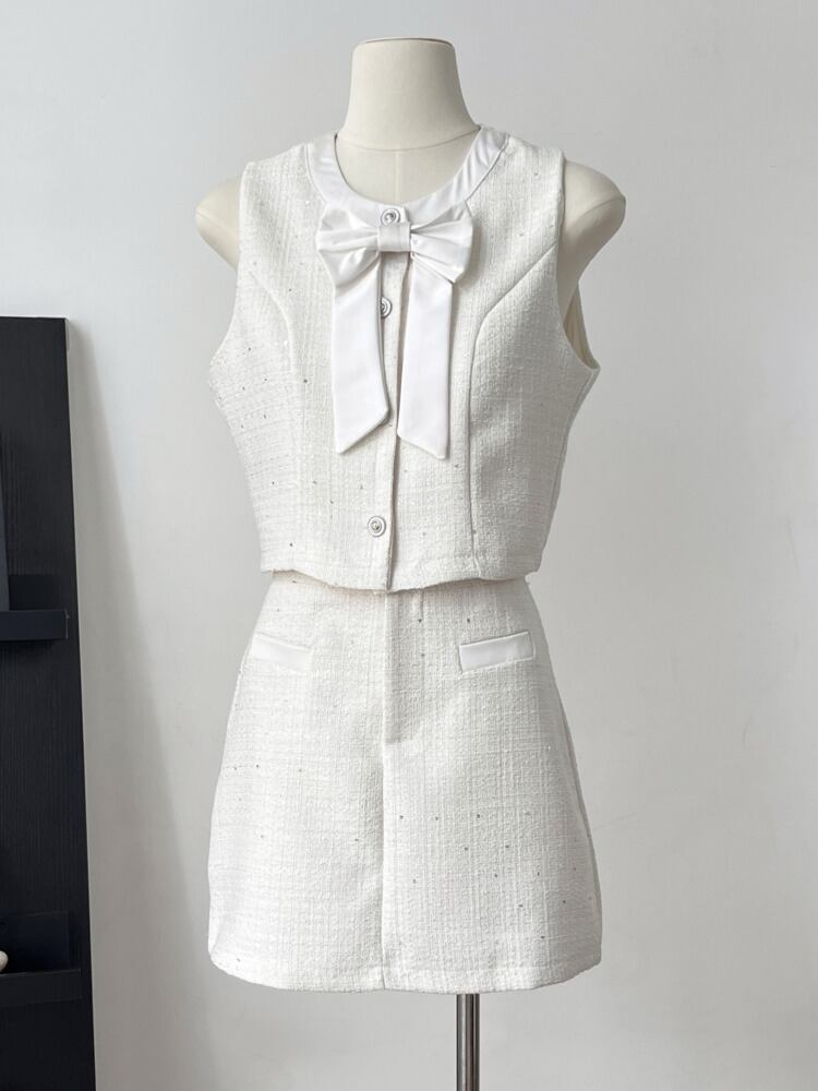 小さフレグランツイード 2 点セットボウベストトップ + スカートスーツガールスイート 2 ピース衣装 Conjuntos Femininos リボン 大人ガーリー スウィート キュート カジュアル