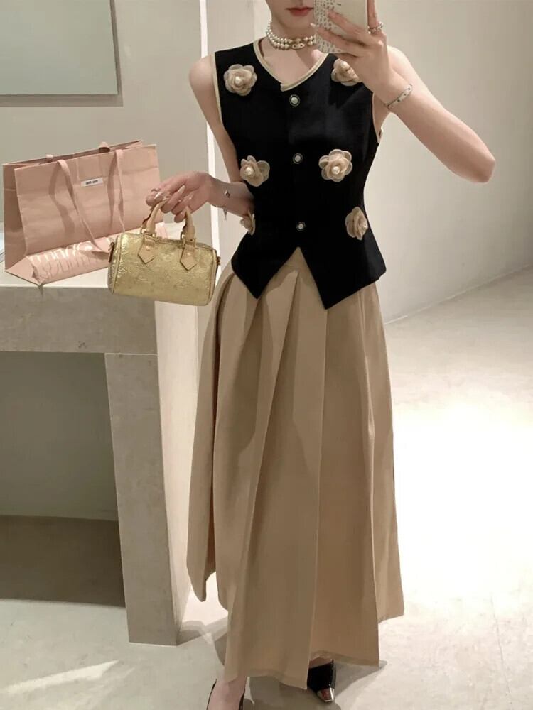 夏小さ香り 2 点セット 3D 花ベストトップ + プリーツロングスカートツーピーススーツ サマー 夏物 フラワーデザイン