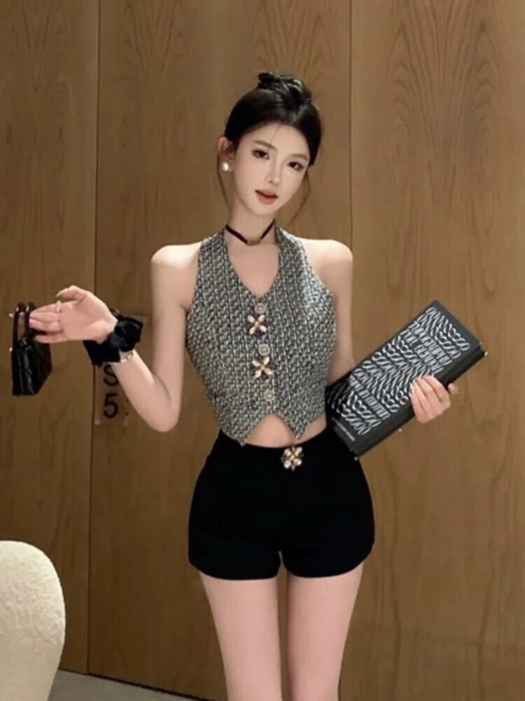 -end フランス小さフレグランス ツーピース パンツ セット高級バックル ベスト トップ + ウエスト ショーツ セット Conjuntos Femininos ブルマー